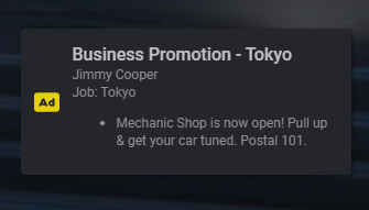 This script allows you to do /promotion (text) with the required job & job role that will then display a notification on screen to everybody in the server, in regards to promoting their business to announce anything (event/business opening etc..)